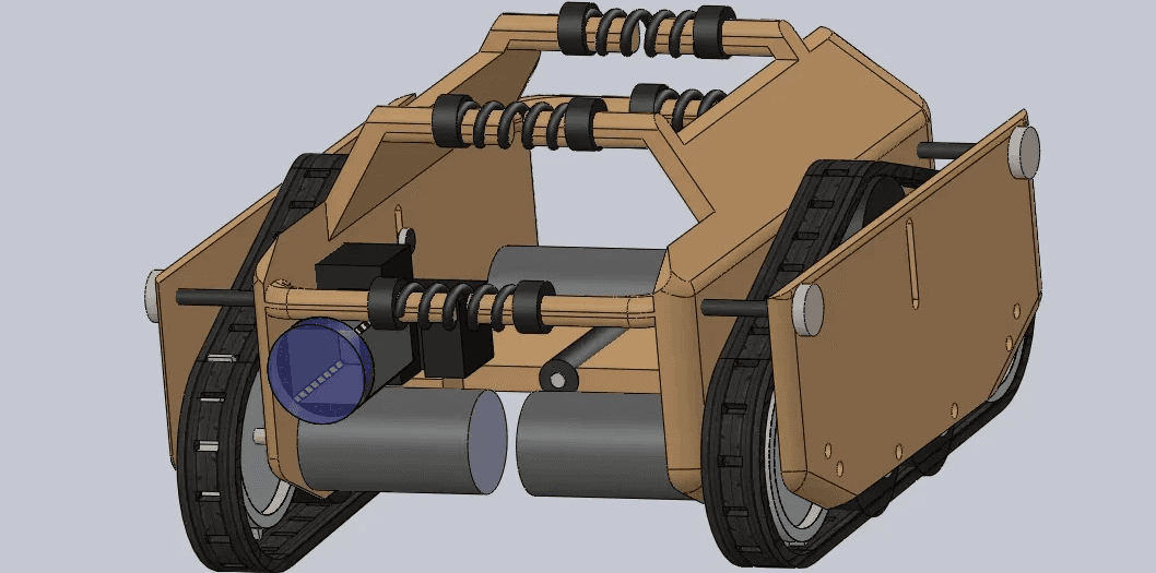 This robot navigates uneven terrain using a spring-supported, centrally hinged structure to adjust its tracked wheels. The system is controlled by an electric circuit and powered by a battery.