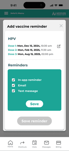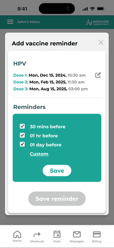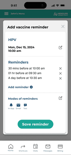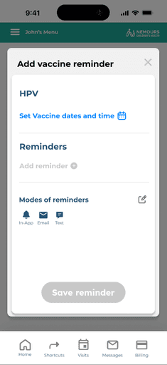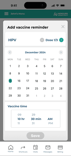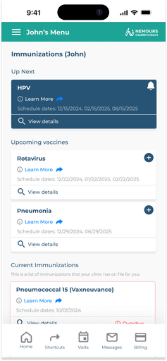 The current Nemours hospital app did not include vaccine reminders. After speaking with parents of pediatric cancer patients, we recognized a clear need for this feature. The cancer treatment process is overwhelming, often causing other healthcare needs, such as routine vaccinations, to be overlooked. With families deeply focused on cancer care, it becomes easy to forget about upcoming vaccines.