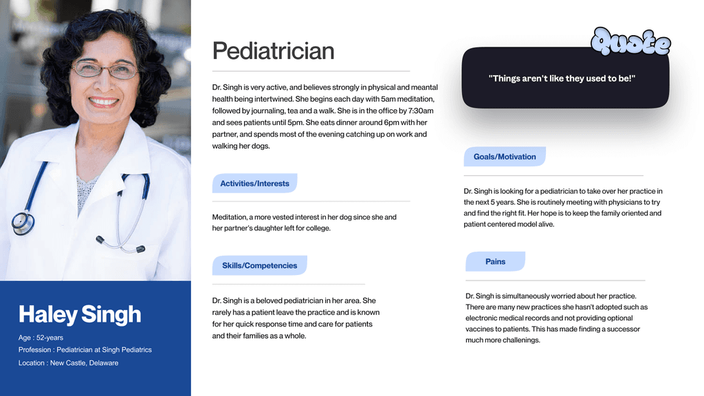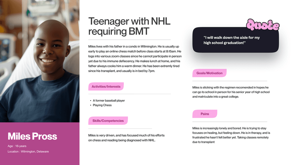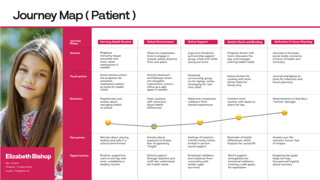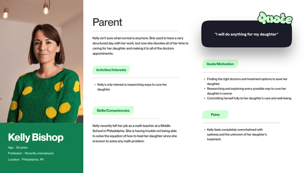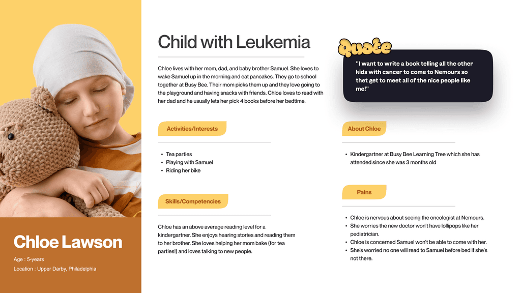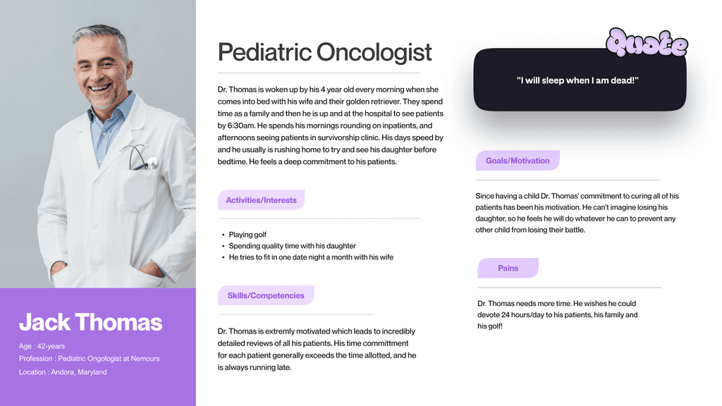 Personas were created for all concerned people related to this problem to understand the unique perspectives, pain points, and motivations of parents, patients, and pediatric oncologists.