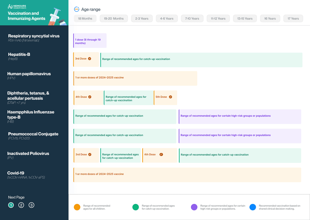 Main Feature: A Vaccine Roadmap that visually displays all recommended vaccines by age, helping parents track immunization schedules.